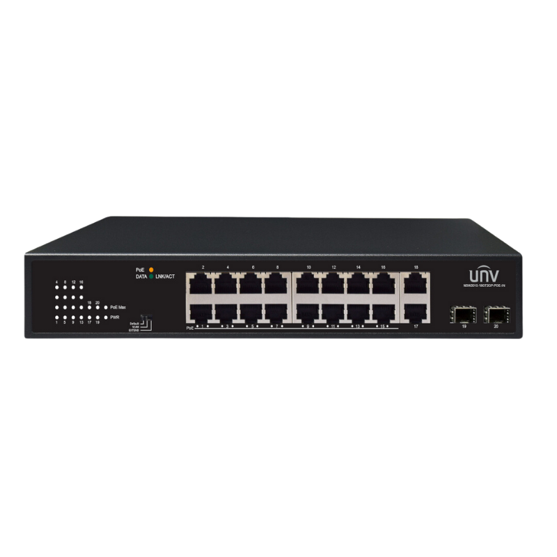 Switch PoE con 16 puertos Gigabit PoE, 2 puertos Gigabit no PoE y 2 puertos Gigabit SFP para fibra óptica. Proporciona un presupuesto de potencia de 200W. Soporta VLAN y transmisión de larga distancia hasta 250 metros. Ideal para grandes instalaciones que requieren alta densidad de puertos PoE, conectividad Gigabit y funciones avanzadas de red.